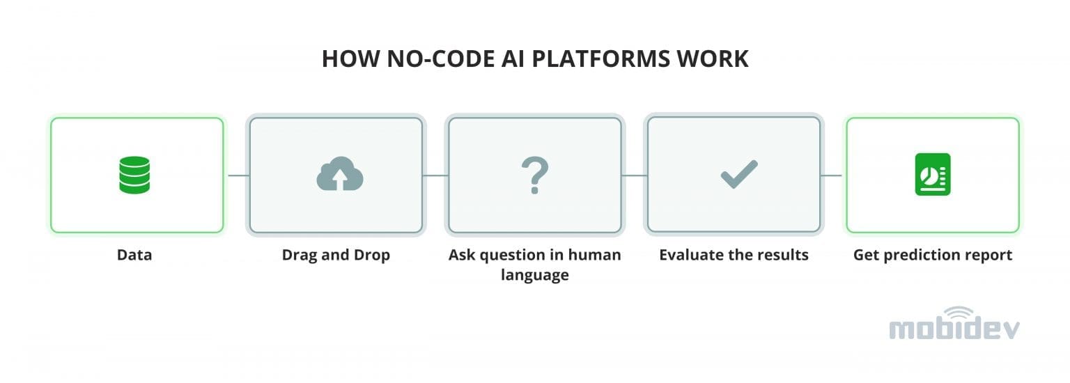 How Does It Work? No-Code Machine Learning works by letting you build AI models without coding. You start by putting your data into the platform. Then, you choose the type of model you want and train it using simple tools. Once trained, you can see how well it works and use it for predictions.